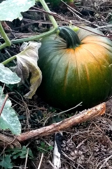 The burn pile produced another fruit bearing vine this year, — a pumpkin plant.